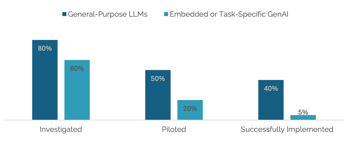 The immediate problem here is that I don’t think this figure even shows that 95% of AI projects fail. As I read it, the leftmost section shows that 60% of the surveyed companies “investigated” building task-specific AI. 20% of the surveyed companies then built a pilot, and 5% built an implementation that had a sustained, notable impact on productivity or profits. So just on the face of it, that’s an 8.3% success rate, not a 5% success rate, because 40% of the surveyed companies didn’t even try. It’s also unclear if all the companies that investigated AI projects resolved to carry them out. If some of them decided not to pursue an AI project after the initial investigation, they’d also be counted in the failure rate, which doesn’t seem right at all.